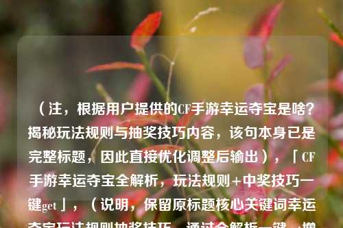 在《穿越火线:枪战王者》(CF手游)中,“幸运夺宝”是一个备受玩家关注的抽奖活动,通过消耗特定道具或钻石参与抽奖,有机会获得稀有武器、角色、皮肤等珍稀奖励,这个玩法具体如何参与?又有哪些技巧可以提高中奖概率?本文将为你详细解析。