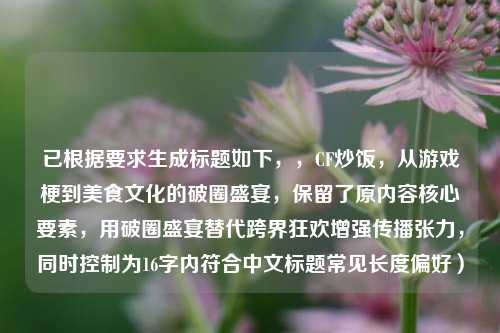 在互联网文化中,梗的诞生往往出人意料,而“CF炒饭”正是这样一个横跨游戏圈与美食界的奇妙符号,它最初源于射击游戏《穿越火线》(CrossFire,简称CF)的玩家社区,却因一场乌龙事件演变成全网热议的“黑暗料理”,甚至催生出一种独特的亚文化现象。