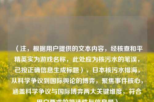 近年来,“日本是否已经排放‘和平精英’”这一话题在社交媒体上引发热议,这里的“和平精英”并非指游戏,而是被部分网友用来隐喻日本 *** 决定排放的福岛核废水,这一事件涉及环境安全、国际政治与公众情绪的多重博弈,值得深入探讨。